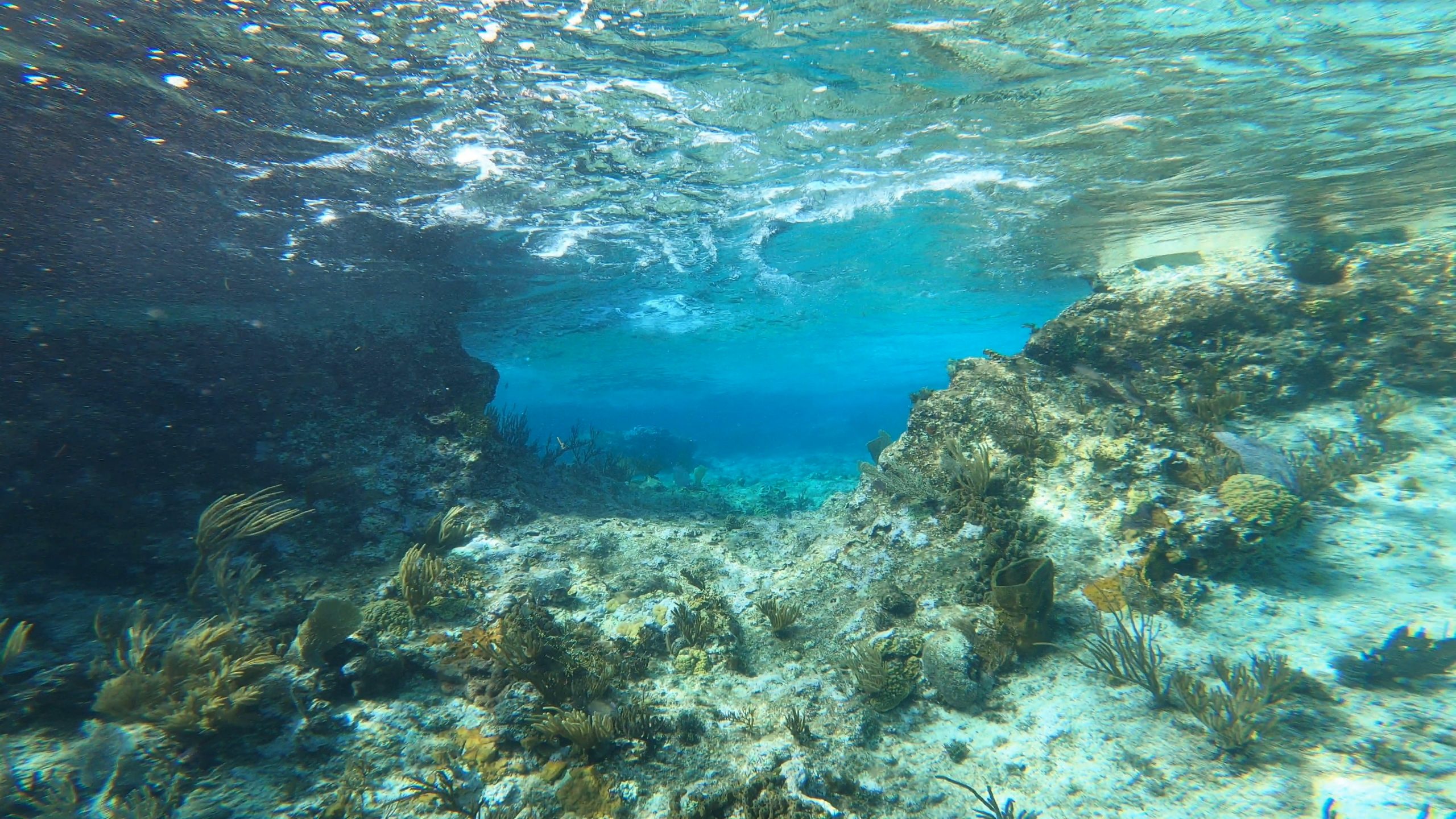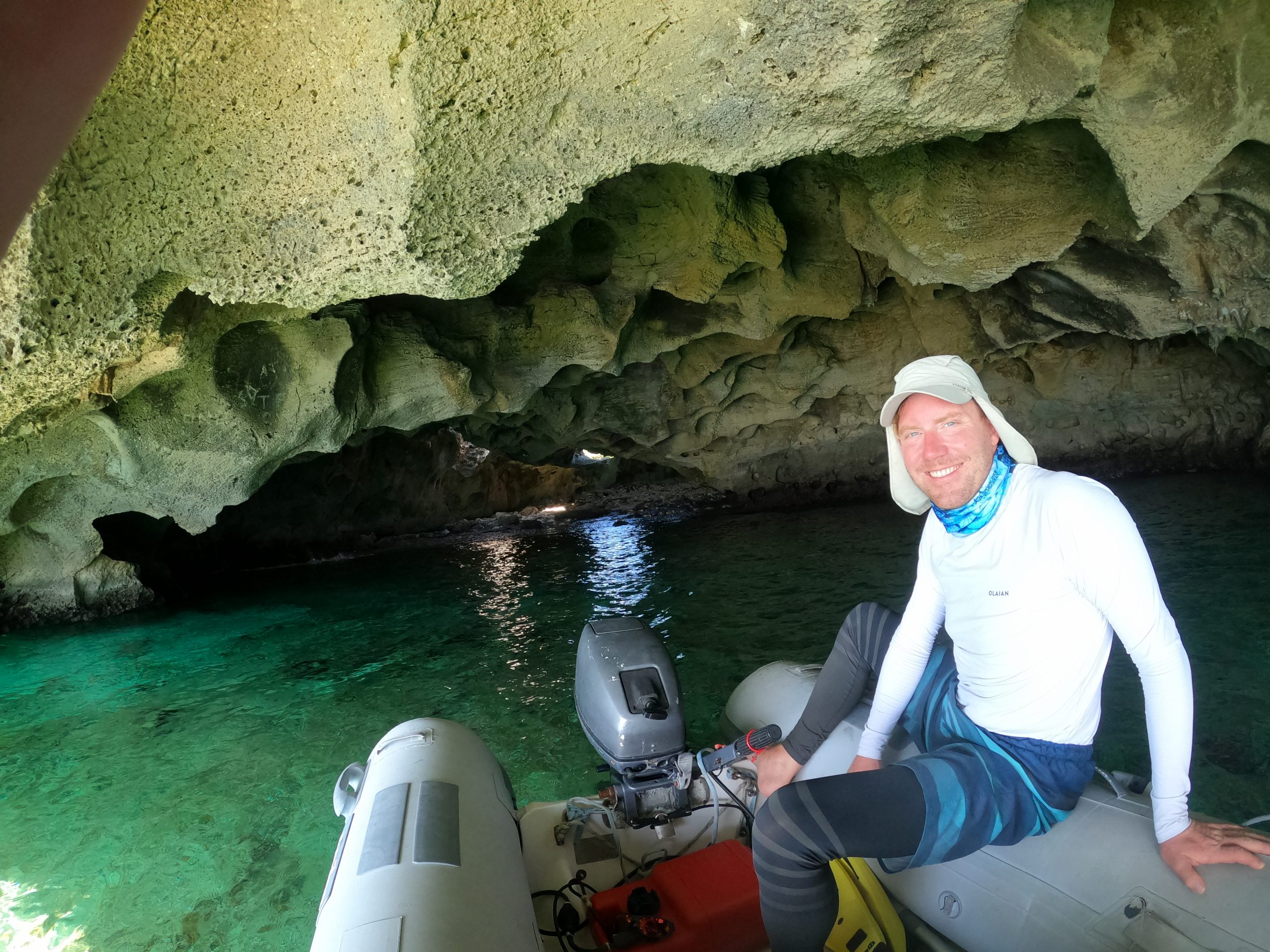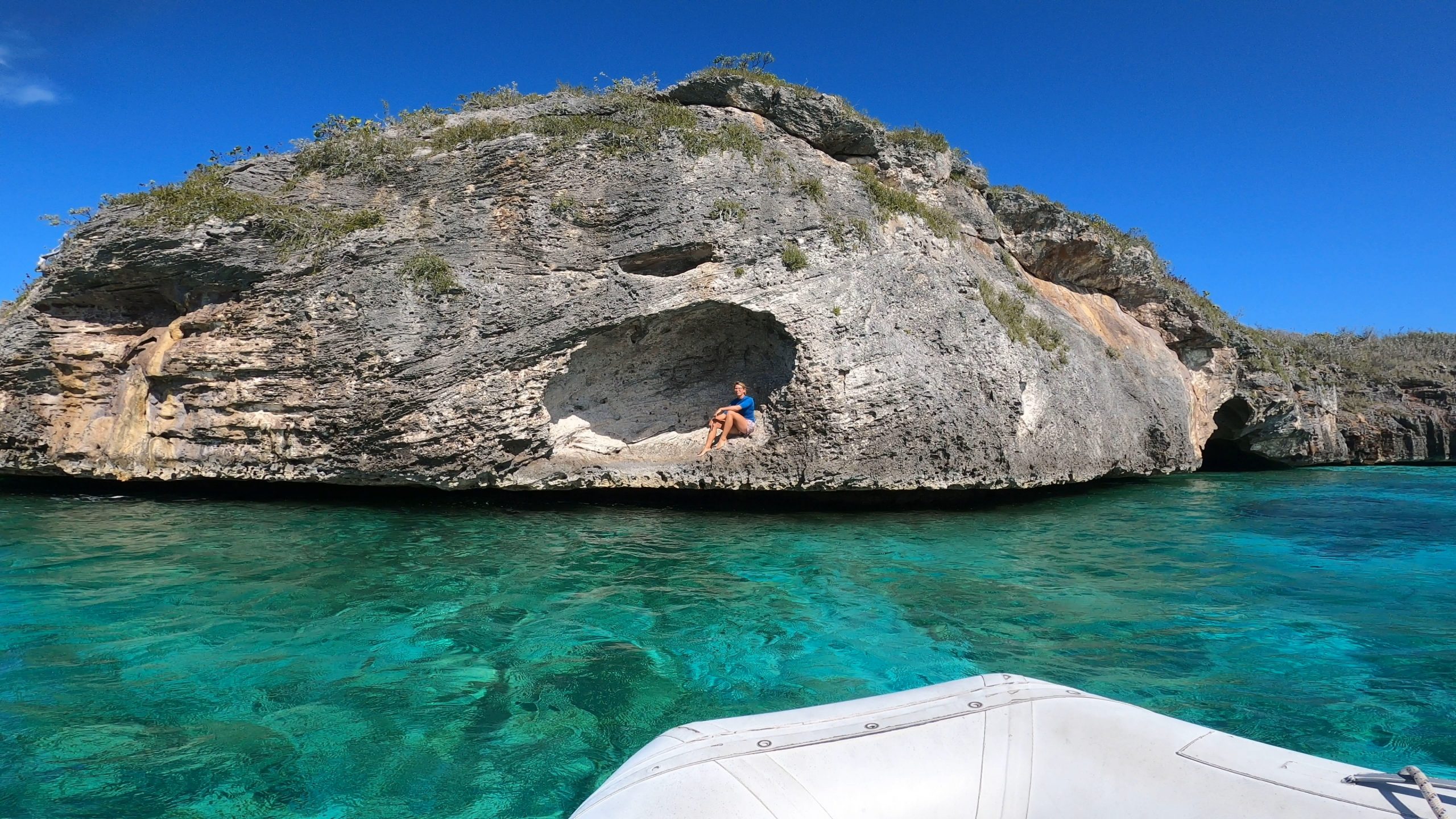 Bevor wir am nächsten Tag weiter nach Water Cay, unserem letzten Stopp auf den Ragged Islands fahren, erkunden wir noch eine kleine Höhle auf Flamingo Cay, welche nur mit dem Dinghi vom Wasser aus zugänglich ist. Eine spannende Sache! Da die Höhle aber tatsächlich ziemlich klein ist, beschließen wir, zum Abschluss unseres Dinghi Ausflugs noch eine Runde schnorcheln zu gehen. Am Nordende der Insel „franst“ diese aus, viele kleinere Steininseln sind das Zuhause von bunten Fischen und Korallen. Nur mit der Strömung muss man hier etwas aufpassen, sie drückt uns immer wieder vom Ufer weg, weshalb wir das Dinghi an einer Leine mitnehmen, statt es zu verankern.